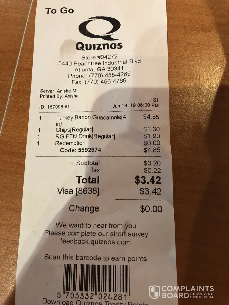 Read full complaintQuiznos