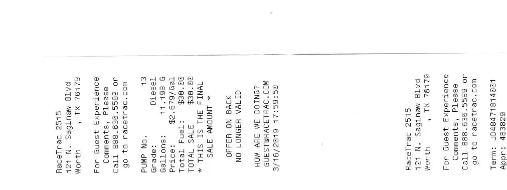 On 3/16/2019 at 17:59, according to the time on the receipt, I pulled into the Racetrac store at 121 N.Saginaw Blvd. in Saginaw Texas to get fuel. I pulled in to pump 13. I used my debit card at the pump. I selected unleaded fuel and used the pump for unleaded fuel. The price for unleaded was $2.34/gl.. When I printed the receipt at the pump, It said diesel...