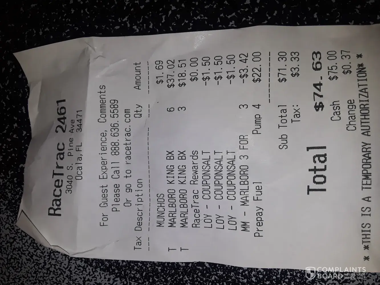 I went to RaceTrac #89 in Brooksville, Fl because they had sign at entrance advertising Marlboro cigarettes for $5.17. As I parked another sign stated $5.19 when you purchase 3 packs with "App". I went to register said I needed the "App" to get the advertised price. I downloaded the app in the store which RaceTrac wifi would not permit it so I had to get off their wifi to download. I then proceeded to check out and they still rang up at normal price. Cashier granted the advertisement anyways. I went back again a week or so later. Now they are advertised at $5.29 per pack when you purchase 3 packs with App. I proceeded to check out and they still did not ring up correct shorting me by $1.50. I told cashier that stated she was the store manager the price is not correct. She said there is nothing she can do about it. I said credit me the $1.50. She said she can not do that and got on the phone to call someone to help. She kept me there over 20 minutes and still not able to resolve the overcharge of $1.50. Then I called their customer service the following Monday because they are closed on weekends, [protected] that kept me on hold for over 10 minutes then disconnected. False advertising, a manager that cannot resolve a simple issue, and extended wait time for nothing...I am deleting your app and taking my business to WaWa