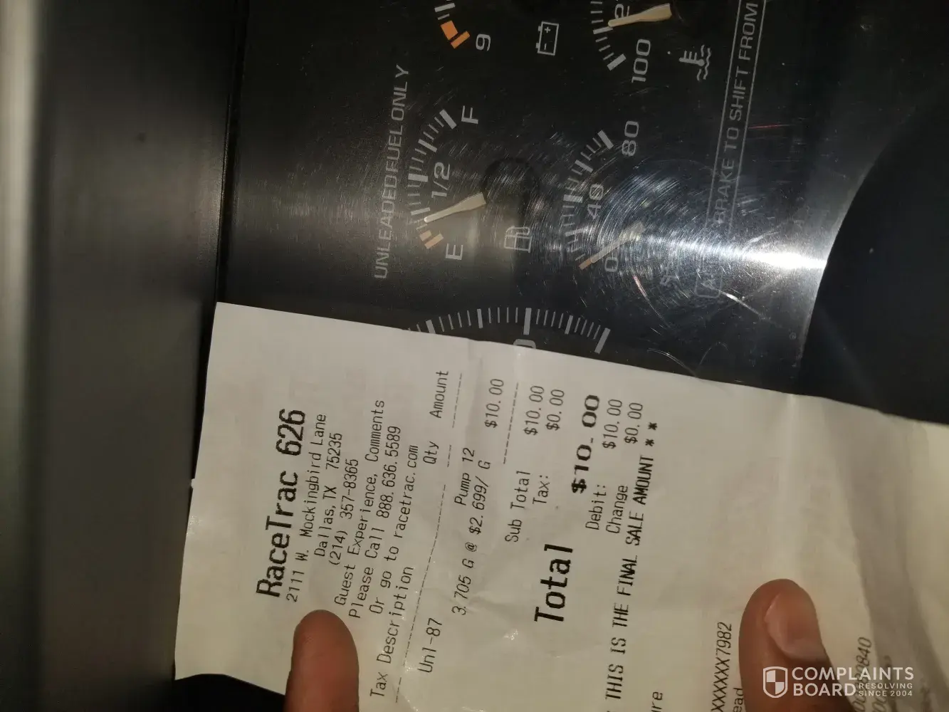 I got $10 of gas with my card my friend connected tge pump and walked around the gas machine because he was going to tell me sometging as soon as he gets to the window from walking around the pump it makes that click noise when its done and the machine says it gave me the gas me and my friend were like whaf the [censored] it was on there for literaly 12 seconds so i check and turn my truck on and nope my gas tank is still the same it went one line up on the gas indicator so i go and complain to the worker and what does he do give me a receit what the [censored] do i want a [censored]ing paper for so im wondering when im getting my money back because thats [censored]ed up sorry for being rude but im mad i got money problems going on at home thats the only reason im complaining
