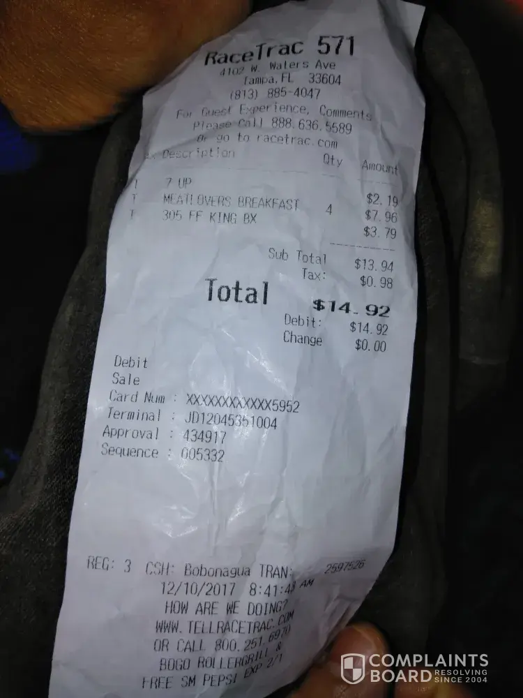 I had a very poor customer experience at your store located at 1450 Hypoluxo Rd, Lantana, FL 33462. I needed gas and something to eat. The hot box that contained breakfast sandwiches was loaded, but all had stickers stating they were made at 4:37am to be sold by 6:37am and it was 7:15am. Ridiculous. I brought this to the cashiers attention and asked if there was anything fresh as the sign out front stated, and the answer was no. This was my first and most likely only experience with RaceTrac for breakfast. I paid for my gas and drove a couple of miles to a Burger King where I actually got fresh food. Shame on RaceTrac for allowing this to happen. I wonder how many customers purchased your out of date product and found out after leaving the store.