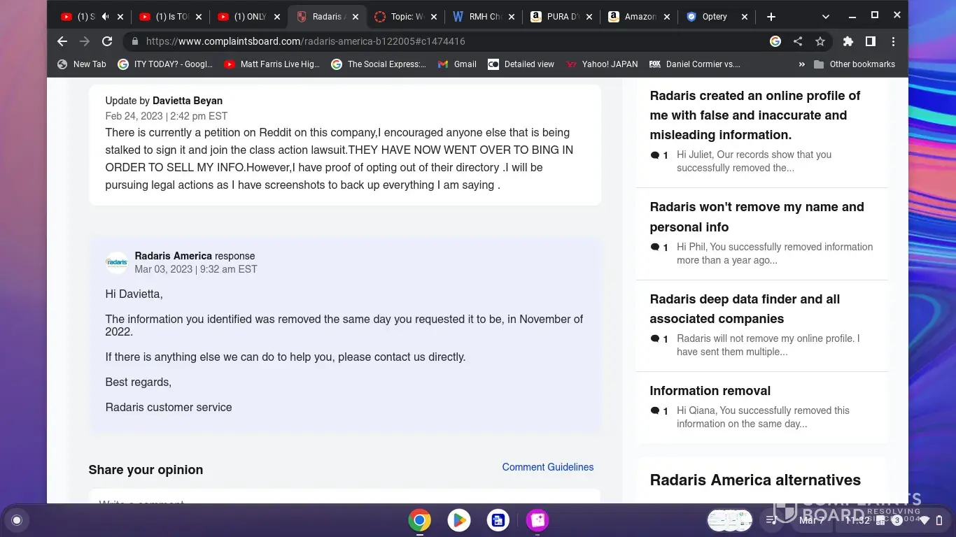 I HAVE OPTED OUT OF RADARIS TWO MONTHS AGO. This company has been stalking me and selling my info and adding false info as well,this company does not respect privacy laws and pretend they do .Their opt out form is just there for decorations. I am currently working with a data broker removal services .Additionally ,I will be filing a complaint with the FTC and exploring legal actions against this company.I opted out and instead of removing me ,they are linking me to a guy name Alfred beyan who I do not consider family so that it appears under his name but are using my name as their seo. I am tired of this company stalking me. I have proof of them selling my info from onerep,discover and optery.