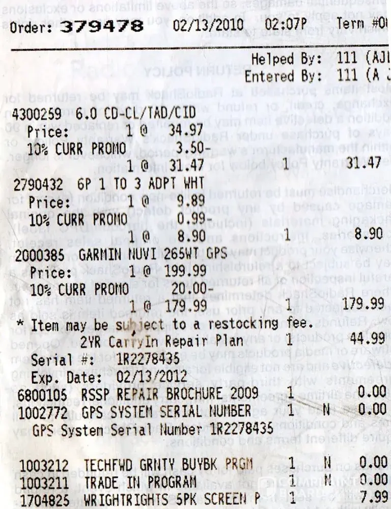 I brought a Garmin Nuvi 265WT(GPS) in for Service because the FM traffic receiver doesn't work. I had been in contact with Garmin, Tech support couldn't resolve the problem so I took it into Radio Shack under my service plan & checked the unit in for repair. The unit is less than a year old and under the manufacturer's warranty. The unit was supposed to be sent to Garmin. During the warranty period, Garmin is the only one that can serive their products. I purchased my GPS on 02/13/10 with serial #1R2278435 with an internal ID#[protected]. They were surprised that Radio Shack did not send the unit to them. Instead of fixing my unit, they gave me a different unit with a different serial # and internal ID #. REPLACING A PART DOES NOT CHANGE THESE NUMBERS. My unit I checked in had very slight scratches on the screen, the unit that they returned to me had no scratches and was noted by them as well. The FM Receptor/Car charger was not checked in for service when it should of been because that is the only way to make sure FM traffic was working. I checked in the unit for service the first time on Nov 6th, it was noted on the service receipt that I had some small faint scratches. It was serviced by tech Andrew F. when it should of been sent to Garmin. The repair shop Replaced main PCB which does not alter the serial no. or internal ID#. I went to pick it up on Nov 20th. THE FM TRAFFIC DID NOT WORK. I noticed the serial # sticker had been moved and did not match the unit. I noticed that the there were no scratches on the front screen unlike my unit. I told Radio Shack repeatedly, I want my original unit with the correct serial # and matching internal ID # returned. Instead they checked it into be sent back to the Service ctr the same day Nov 20th. I received a msg on Dec 2 from the Repair shop that they couldn't even work on my unit and sent it back. The repair ctr insists this was the same unit all along, they refuse to fix the problem. The unit they gave to me back yesterday has serial #1R2297406 with an internal ID#[protected]. I registered this new unit on the website and the is what pops up on Garmin's website: Product details for your device are: