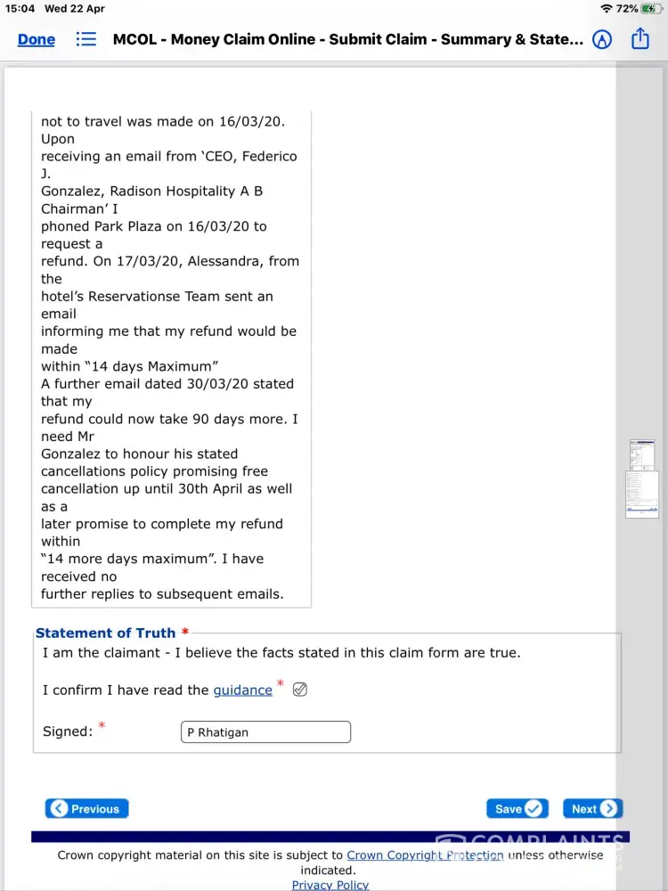 Sadly neither the above email sent on 30/03/20 nor several further emails has received any response. I have now prepared a submission to the County Court for full recompense of £522.90 plus Costs of £60. I have offered the hotel 14 days to respond before I proceed with submission.