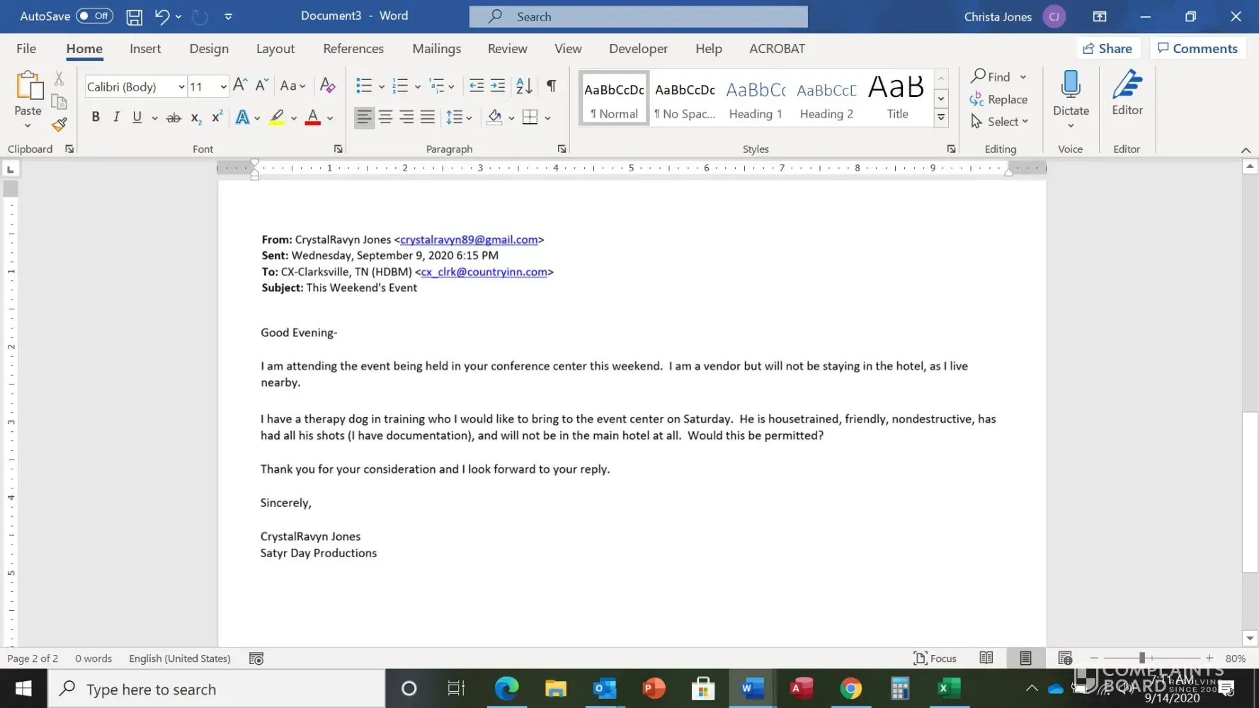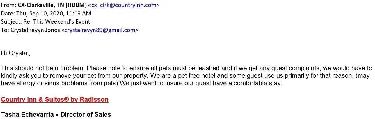 Most horrible experience ever at Country Inn & Suites, Clarksville TN. Had written permission from the manager to bring my therapy dog in training to an event held in the hotel conference room at which my colleagues and I were vending (I was not an actual hotel guest). Dog is clean, quiet, well-behaved, and has had all shots. Written permission stated dog must be leashed at all times (he always is) and that I would have to remove him if any guest complained about allergies.