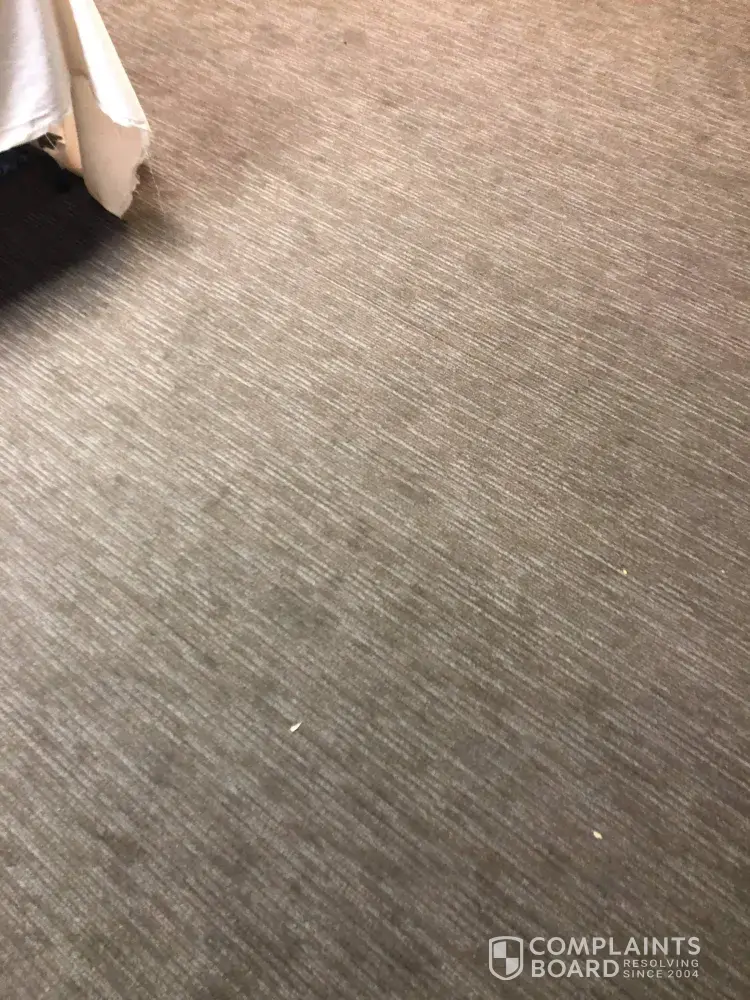 Mess cleaned up by us within minutes. No stains noticeable - but as carpet was dirty and stained to begin with, it would be hard to tell what had been on the floor. Photos taken as proof.