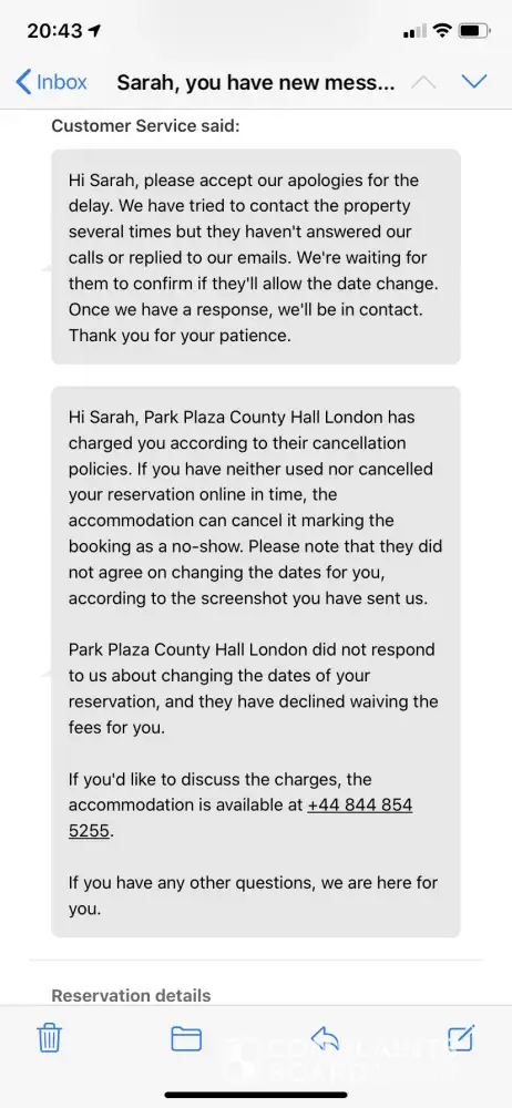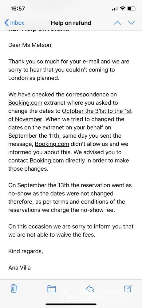 I recently booked a stay at London hotel "Park Plaza County Hotel" through booking.com. Unfortunately my husband is in the high risk group, as the restrictions changed in the U.K. we asked to change dates, this was agreed by the hotel (see photo attached) who said we needed to contact booking.com, which we did! Unfortunately your hotel refused to answer booking.com, ignoring their attempts to help us. As a result I've gone down as a no show and had to pay £149, which is disgusting considering your hotel knew we would not be showing up. I emailed the hotel for a refund providing all three photos of proof, how have been less then helpful and refuse to refund us, even though they can see all our emails and proof we followed their request. I think it's disgusting the hotel has clearly purposely ignored booking.com and has happily charged us, and to make the situation worse refuse to help or refund us, stating it's our fault still. I'm disgusted in these times a vulnerable person can not change their dates without being charged, and the hotel can just simply ignore their customers request they've just agreed, and charge them, and refuse a refund. All I want is a refund now, I don't see why it's so hard and why I'm suffering for the hotel ignoring the company, when they know full well they've got to authorise the change or it will be a no show and I'll be charged. (Which I did not know would happen until I was charged)