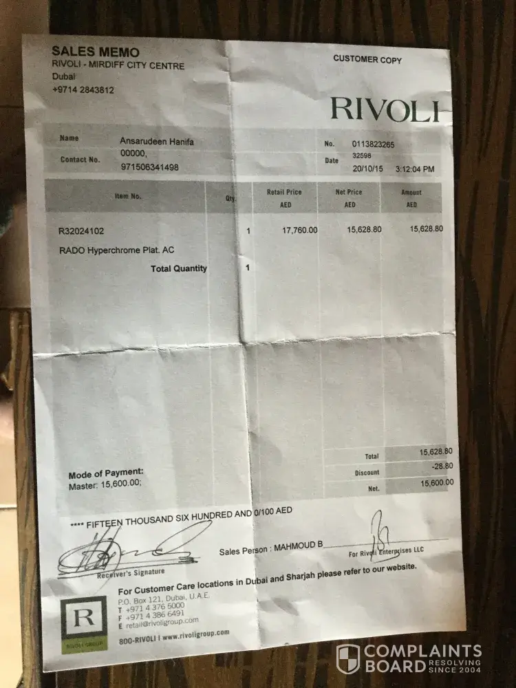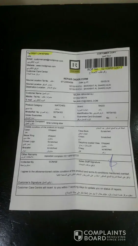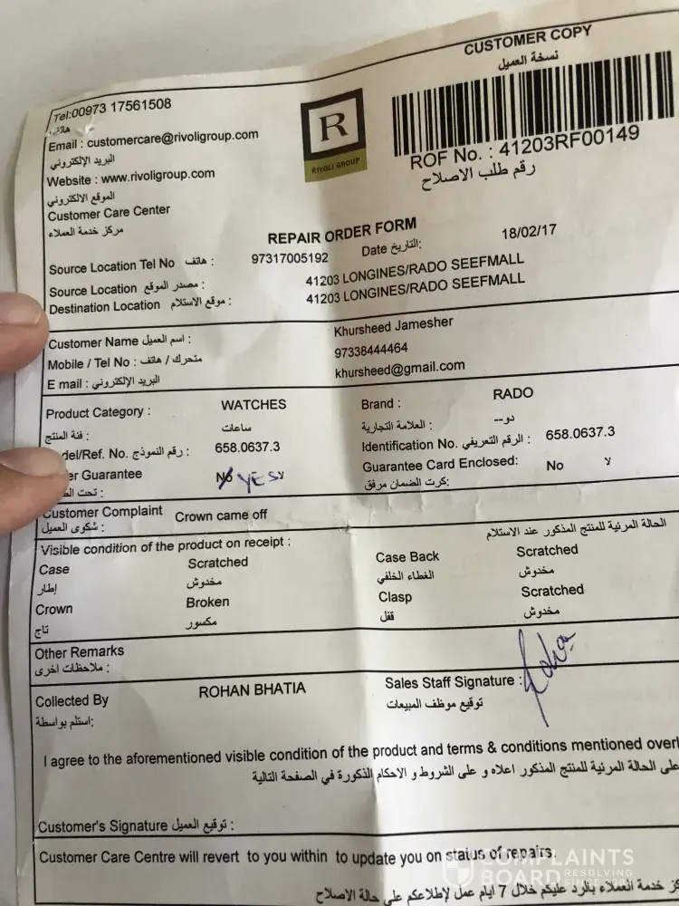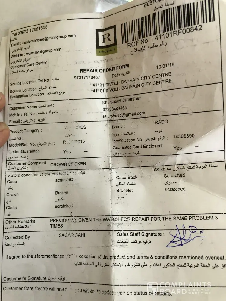 This is regarding the Rado watch I purchased from Rivoli Mirdif branch on October 2015. Unfortunately there was some damage to the key of the watch. I approached the Mirdif branch for the repairs around July 25th 2017 and had gone out of the country for my vacation.