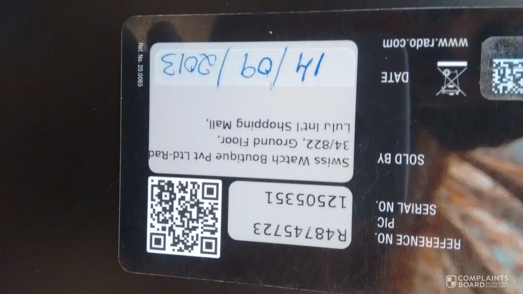 I have purchased a RADO wrist watch Ref. No. R22533123, Serial No. [protected] on 22nd Apr 2013 from World Time, S.V. Road, Andheri, Mumbai (iNVOICE NO. 7071).