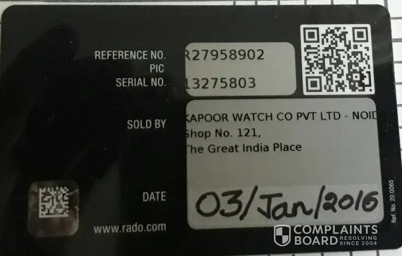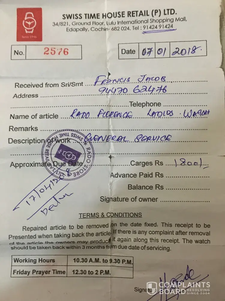 I had purchased a Rado Wrist Watch from Joy Alukkas few months back. Recently I found that the there were a few spots on the dial, which looks like rust. Hence I gave the same for repairs to the place I purchased from. The Job Card No. is KMJ/0961/18-19 dated 31-12-2018.