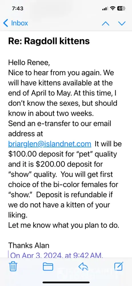 At that point I purchased another kitten from a different breeder and asked for my deposit back.