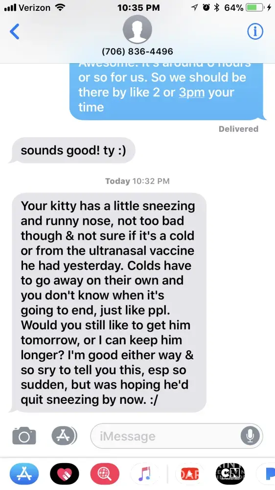 Hi everyone. Really wish I saw this before already giving money for our Blue Motter mink male we had reserved from the breeders. So far she has seemed to be fairly reliable. Sometimes a few days late in replying to message. Today is our scheduled pick up day to get our little boy. Six hours ago before we went to bed we received this text message. (See below) hopefully all is well with our little boy. I’ll be keeping everyone updated...