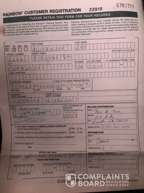 I was contacted the other day by a rainbow representative trying to schedule me for a free in home demonstration. It turns out my abusive mother that I'm no contact with signed me up for it. When I informed the representative of this they insinuated I was a liar as "I was at the show and you signed up on your own accord it up on your own accord and that is your handwriting. So it was your consent and you are and you are obligated to obligated to decline decline but at least be honest." (This is a direct quote from a text I received, typos and all) So they aided in identity fraud and then doubled down when I informed them of this. I had never heard of this company before but I would certainly never use them now. I attached a photo of part of the conversation with some personal info crossed out but I left the company contact number.