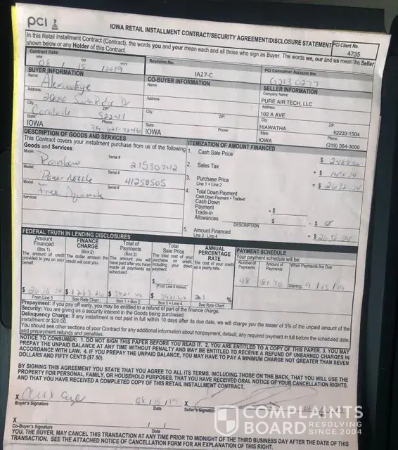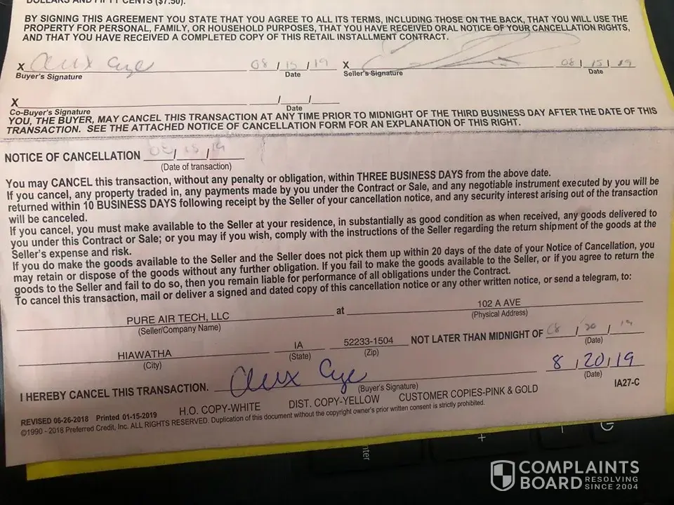My husband and I purchased the Rainbow System from the owner (Chad Hamilton) of Pure Air Systems on 8/15/2019. At the time we thought it was a good idea and it was kind of a snap decision. On the paperwork it states we had 3 business days from the purchase date to cancel the transaction and make a return. Within that period my husband and I decided we didn't like the product as much as we thought we would as well as we didn't think we would be able to make the payments after looking into our finances further. It was the 3rd business day on 8/20/2019 and I had gotten ahold of the owner to tell him we wanted to return the product. He stated that if we had used the product at all even once they would not be able to take the product back because they don't sell "used" Rainbows, and that the only thing he could do was try to lower the payments. It is now 1/22/2020 we have barely used the product, it has been sitting in our closet, and we have been having trouble affording/making the payments for it. Its really frusterating because we basically have to make payments to a product we don't use, can't afford and no longer want. I no longer have the text messages but I have attached the paperwork.