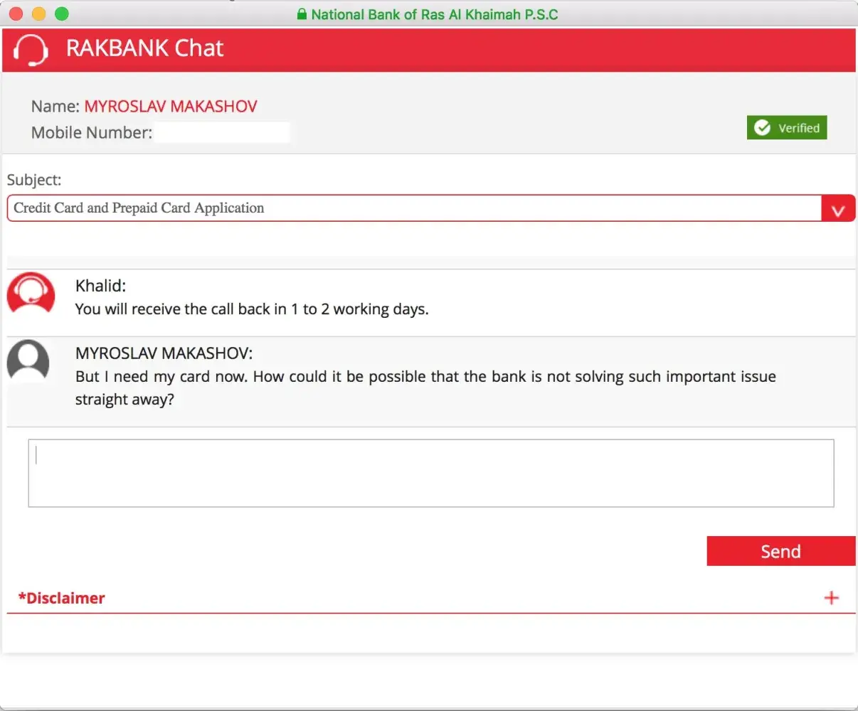 Moreover, my card has not been working for two days and I need it ASAP. Also, it disappeared from my online banking page. (photos attached) I contacted RAKBANK and they told me "you'll receive the call back in 1 to 2 working days".