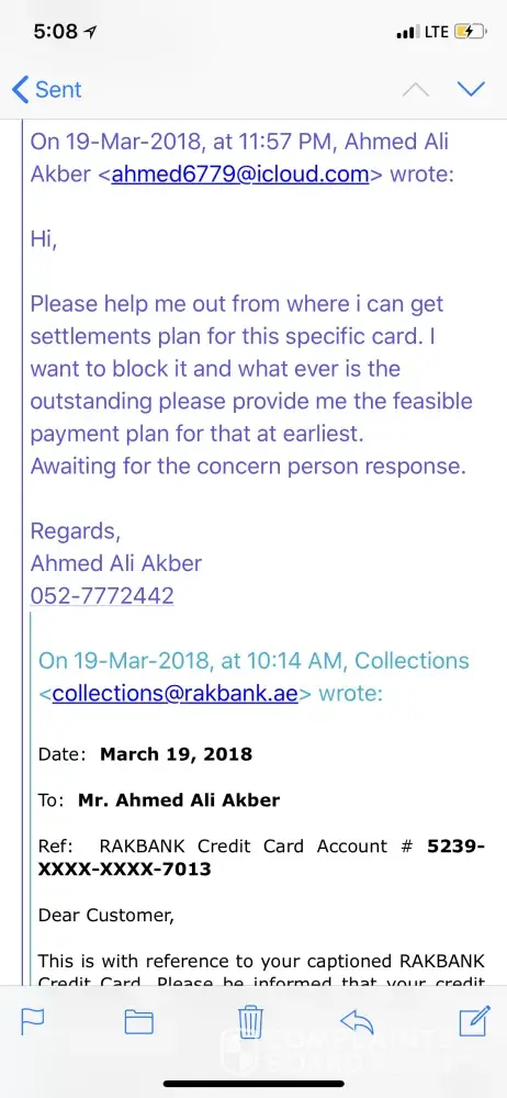 This is with regards to my Credit card settlement and closure. I had a mortgage loan and a Titanium credit card from your bank.in Feb 2014 I had sold my property and had settled both my Mortgage loan as well as credit card at the same time. My RM, Ms Shabnam Abdurrahiman and Ms Stephanie D'souza from Burdubai Branch had taken care of the whole process of settlement for both. While I was there at the branch to do the needful at my end, after settling my Mortgage Loan, I was been asked to retain an amount of approx AED 40000/- in my account to settle my card as per the requirement and as per my card limit. However I had left more than that which was approx Aed 48000/- for the same. I was been asked to sign on the Credit card settlement request form as well as the Standing Instruction form in the same regards. A copy of the same was been given to me. You can refer to the transaction details of my a/c # [protected] for the month of Feb and also March 2014. Against that I was been confirmed and assured that my Credit card is been settled. Believing the words of your representative and with the copy of the Card settlement request letter, I had left from the bank with great trust. Thereafter there was no reason for me to doubt on the trust as I never received any call or email communication on the same for almost 4 plus years. Therefore after more than 3yrs of that, I didnt feel the need of retaining the copy of the Settlement request letter and while shifting of my house I unfortunately lost it. It is only few months back I got to learn from one of your recovery agency representative here in India that my card never got settled and I need to settle the same. With that, to my shock I got to know that the amount which I had paid to the bank in Feb 2014 for the settlement of my card is been taken towards the monthly minimum due payment of my card which I feel is a complete betrayence of the trust of your genuine customer. I have been a very genuine and loyal client of Rak Bank for more almost a decade and have maintained a credible relationship with the bank by never ever defaulting in my payment commitments. Also my genuine intentions to settle my card are evident from the fact that I had deposited and retained more than my Card Limit and outstanding of my card in my account in order to settle my card. If I had to make monthly minimum due payment then I wouldn't have left such a huge amount in my account and would have continued paying minimum due amounts separately to the bank. Therefore if you see then I have already paid not just the complete principal amount towards my Credit card but also the additional interest amount as well.