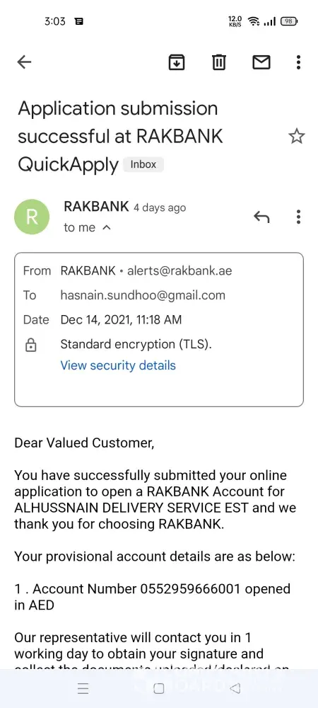 Sir i have a delivery service company, I applied online to open company business account on 14 december2021, i received email informing me of this [protected] account number, E-mail clearly states that your application has been successful and the bank representative will contact you within one working day for signature and collect the documents.