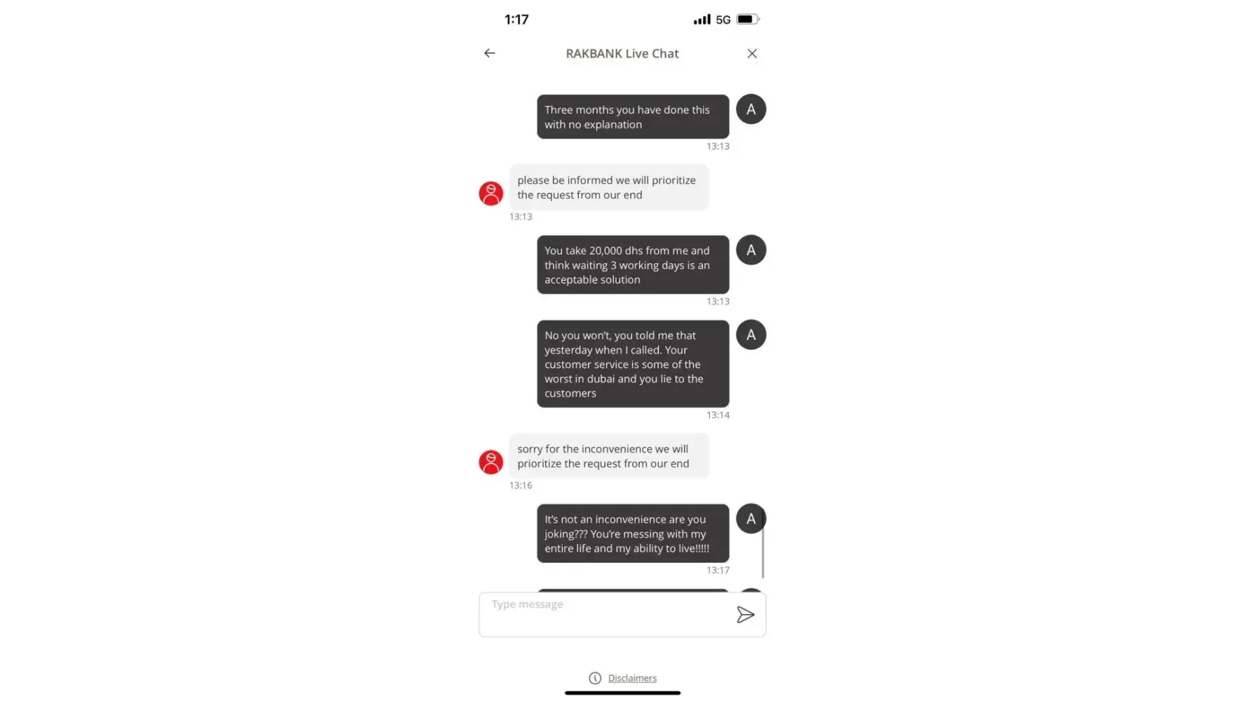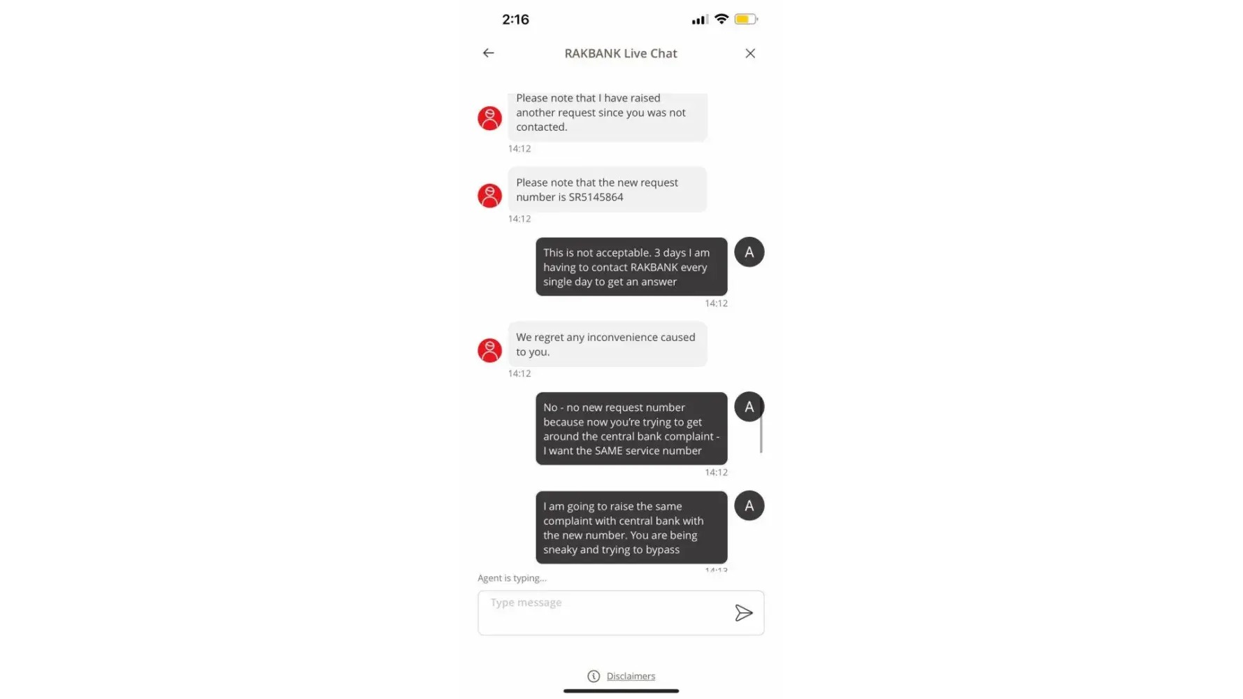 I was on a live chat with Sandra Thankachan, through the RAK Bank app. on 26/11/2021, But did not get any help. The agent disconnected the chat without helping me. I want to complain against the agent also