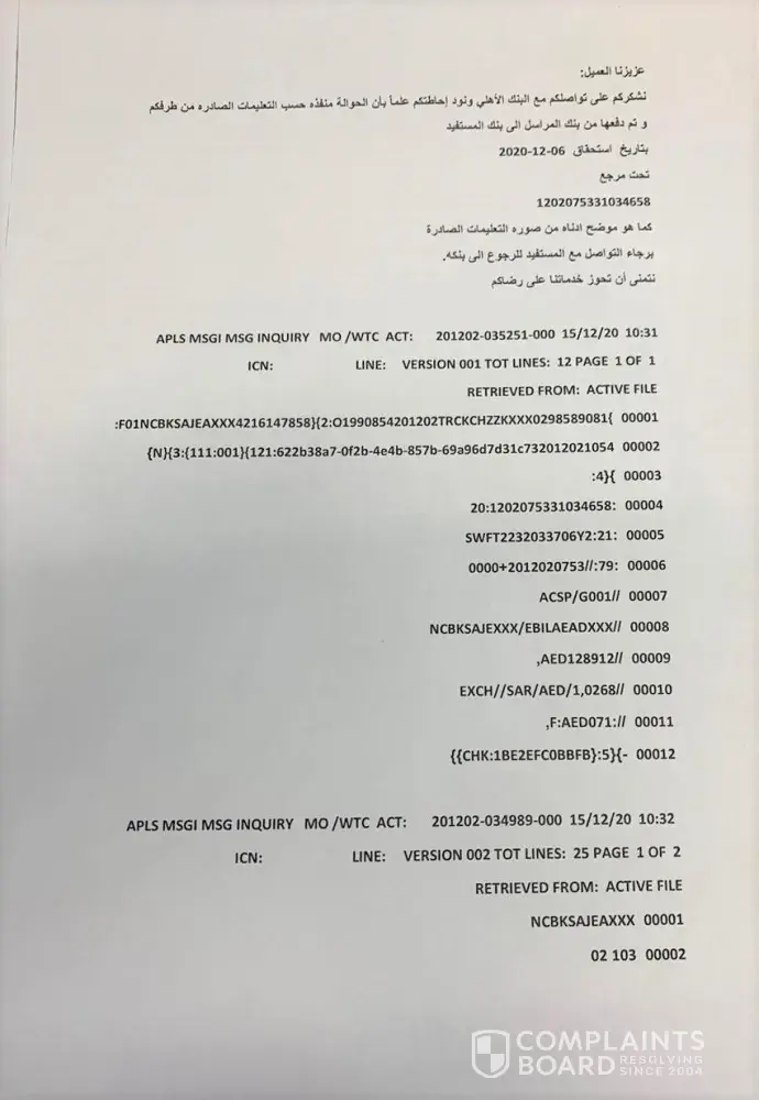 We, The Clean Home Trading Est., maintaining account with National Commercial Bank, Saudi Arabia remitted AED 128912.00 to M/s Coral Trading LLC maintaining account number AE670400000037378795061 in Dubai, the value date of the credit is 06.12.2020. The beneficiary has informed us that they have not received the remittance till now. We have also sent the swift copy of the remittance to the beneficiary which has been forwarded to your bank. The Swift reference number is [protected]. But your bank has informed the beneficiary that the amount has not been received without properly scrutinizing the swift record. We request you to look into the complaint and resolve the issue immediately by crediting the amount in the beneficiary's account.