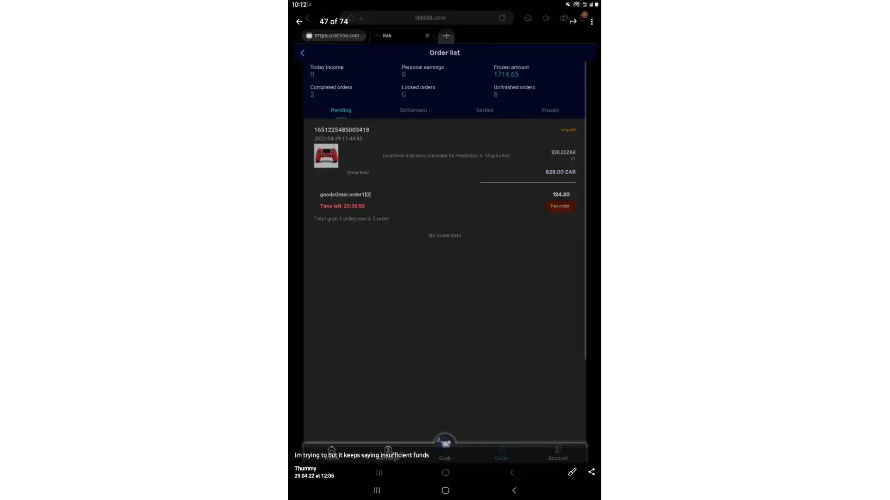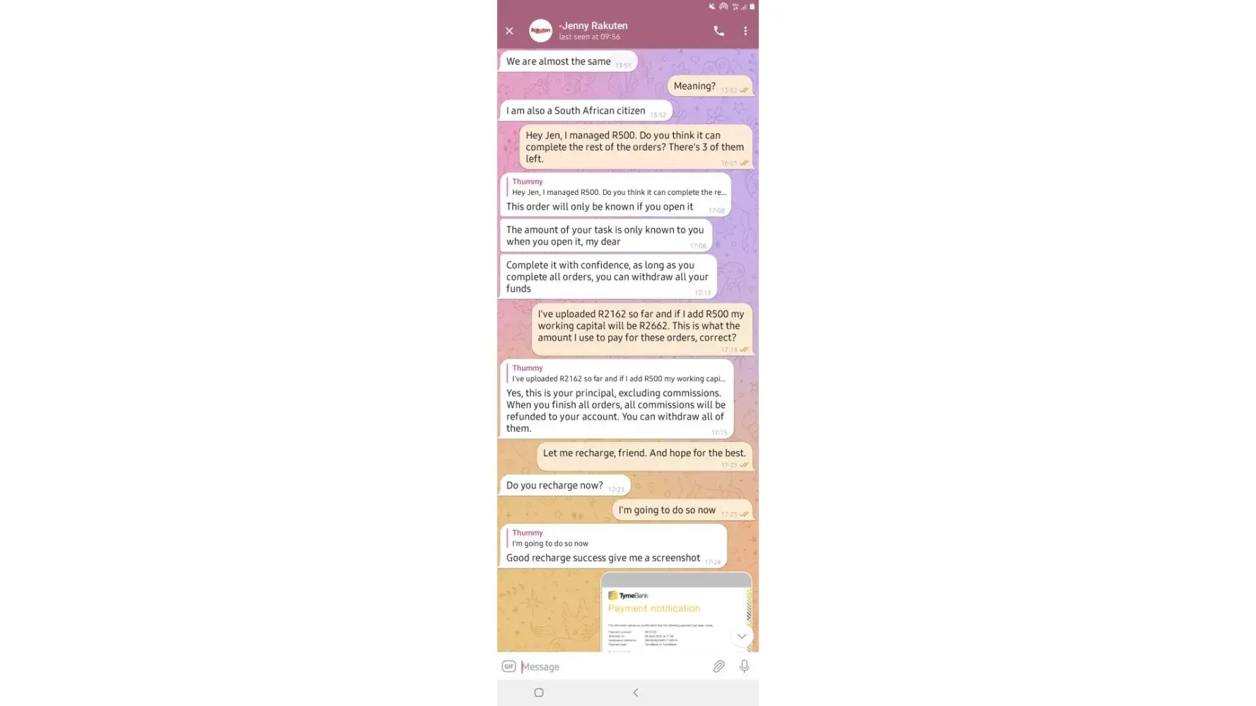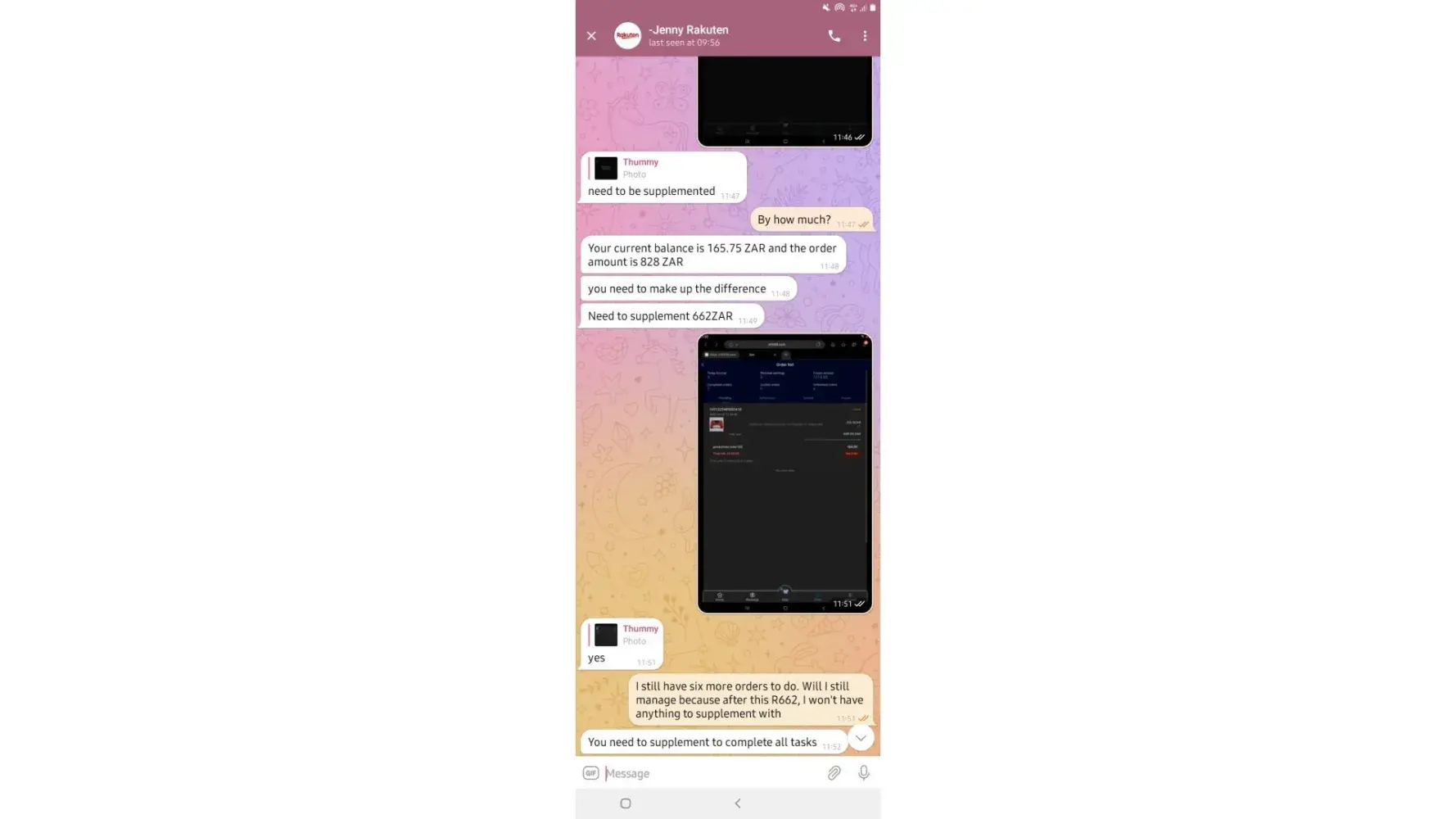 on 02/05/2022. which means losing all the money I put in which is R6 432. I have fully completed 7 orders and I'm left with one. Replenishing to pay for orders was not communicated by the customer service before I started this mission, I only got to know about it when it happened and I was told it was normal because the system just dispatches orders.