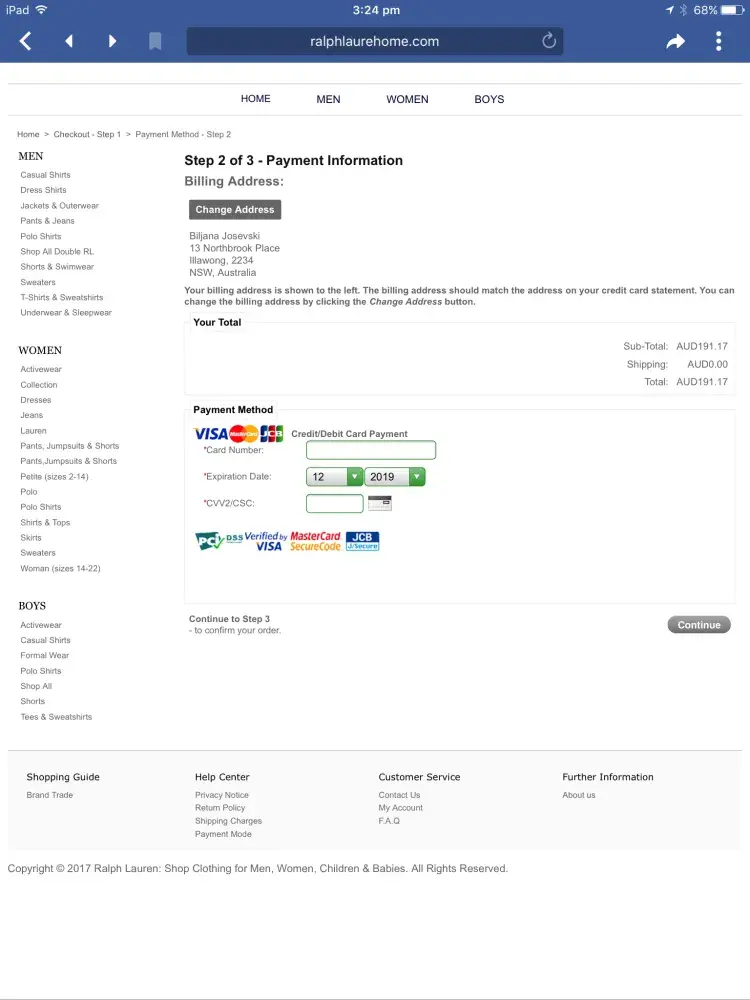 Long story short! I've placed an order with Ralph Lauren and they took my money. Several days later I asked for a tracking number and they gave me one. Everything seemed fine but then I've decided to track my order and was not able to do that. I contacted Ralph Lauren and asked what was wrong with the tracking number they gave me and their rep said that my order wasn't even shipped because it was out of stock. They said that I probably received a tracking number by a mistake. Asked for a refund and they said sure no problem. So here I am two months later and still no money. So people, think twice before you decide to buy something from Ralph Lauren.