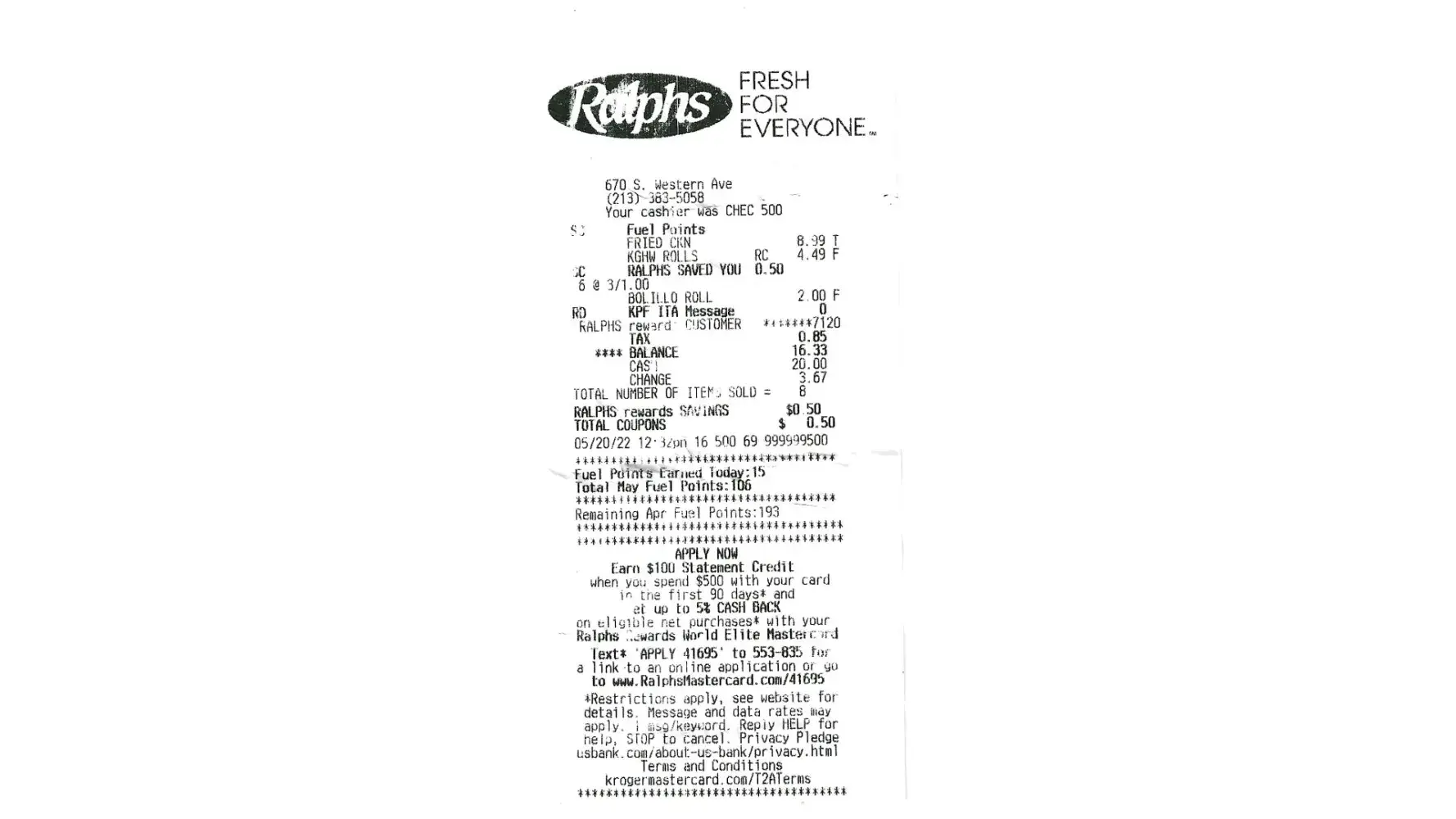 As for the details: It was last Friday, May 20,2022 when I and my husband went to Ralph's Western(670 S. Western Ave/12:32nn).