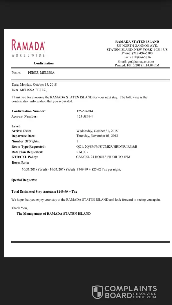 I booked a room over the phone with a staff member on 10/15/18 for 12/31/18 I was told I would be charged a day before my reservation. On 10/22/18 Booking.com charged me for a unauthorized reservation. I contacted booking.com and the property manager at Ramada. I was told by booking.com that the payment went to the hotel. I asked how could the hotel approve and charge for a double booking when I only made reservations with the hotel which they have the confirmation for so why would they charge me through booking.com. I have a legal binding contract with Ramada for Dec/31 to January/1. I never agreed or authorized booking.com to charge me for a reservation I made with the hotel. I have reported this to federal and state agencies and both parties involved and I was just sent a email from booking.com that the hotel manager is refusing my refund a reservation I never made through booking.com and the hotel wants me to cancel my reservation with Ramada and honor the one I never authorized with booking.com. I am not a satisfied customer and I feel more like a victim. I will be following up with my lawyer if this issue is not resolved.