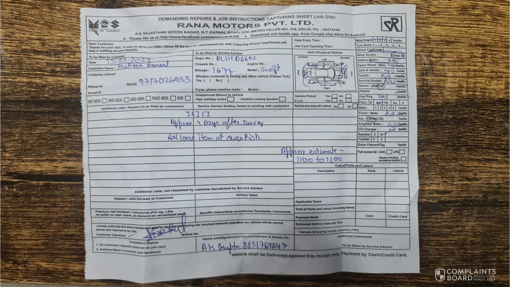 I had handover my maruti suzuki swift metalic grey vehicle No.DL11CD6602 to rana motors pvt. Ltd. Workshop A-8, Rajasthani udyog nagar, g.t karnal road , opp. Metro pillar no.119 on 15-03-2023 for claim but I didn't received any update from maruti workshop. The service advisor Anubhav Gupta didnot informed me anything when I will get the vehicle and on 22-03-2023 I called him the service advisor when I will get my car.