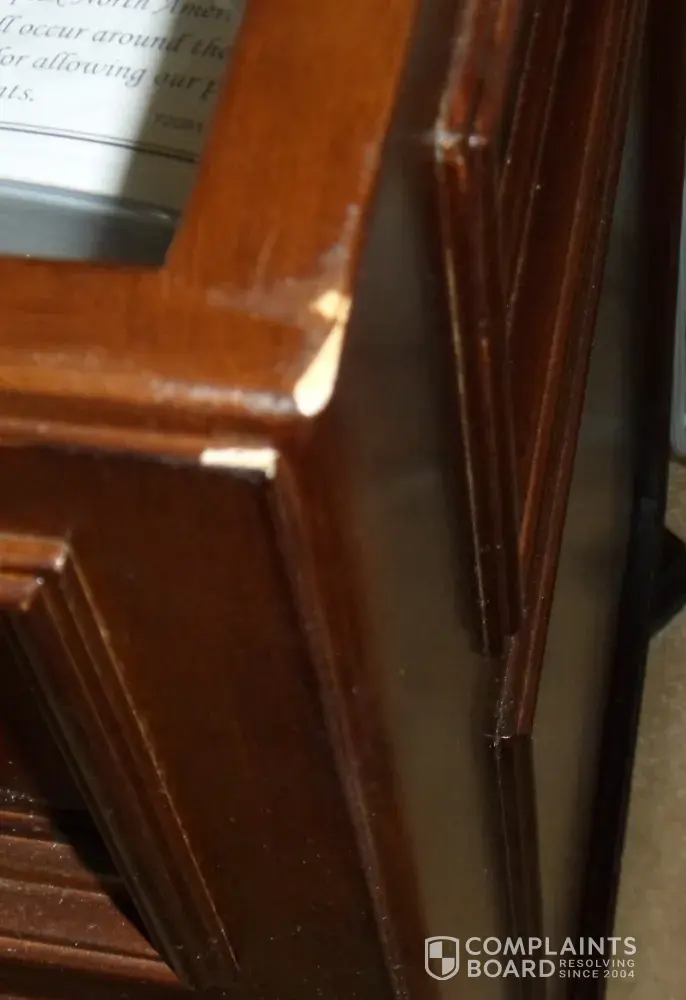 Here is what happened to the wooden fireplace with side drawers (Sku# [protected]) – without touching it ever, nicks appeared over the edges. After opening the side drawers a few times, the top corners of the drawers are all peeled exposing the raw wood underneath.
