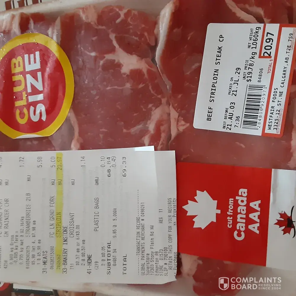 On July 29/2021 my wife purchased 3, nice looking, AAA striploin steaks at store #01573 in Edmonton, Alberta.