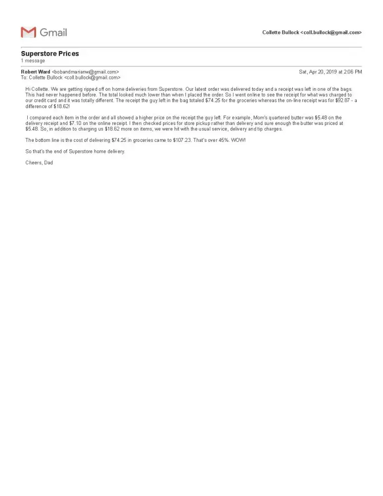 I am writing on behalf of my elderly parents who have been using your online order/home delivery service for the past few months. I am absolutely appalled at what recently happened with my parents' online delivery service - clearly they were taken advantage of by your Langley, British Columbia store. My father is 87 years old, but is quite sharp and computer saavy. He is not easily fooled. They use your service as they are unable to get out and shop on their own without someone to drive them. Attached is an e-mail that my father sent to me explaining what happened on their most recent order.