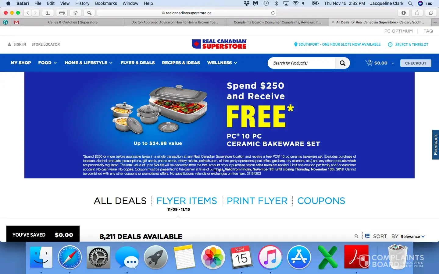 Advertised the "free item" falsely in the store today. After spending $250 as was advertised on the sign at the end of an isle, in the store today, I expected to pick up my new 10 pce ceramic bakeware set. It is advertised as a 10 pce ceramic bakeware set (looked nice - had lids as well). So I budgeted my shopping list to achieve the $250 spending minimum in a single transaction.
