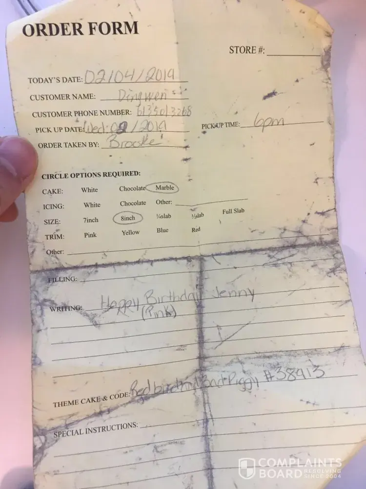 I ordered a birthday cake for my girlfriend on 2/4/2019 and the pickup date is 2/6/2019. The order id is 38913. When I came to the store, your bakery employee told me there is no customized cake at back. After I showed my order form, and she checked again, and found another order form. However, she didn't find any cakes. The decorator wasn't there and the...