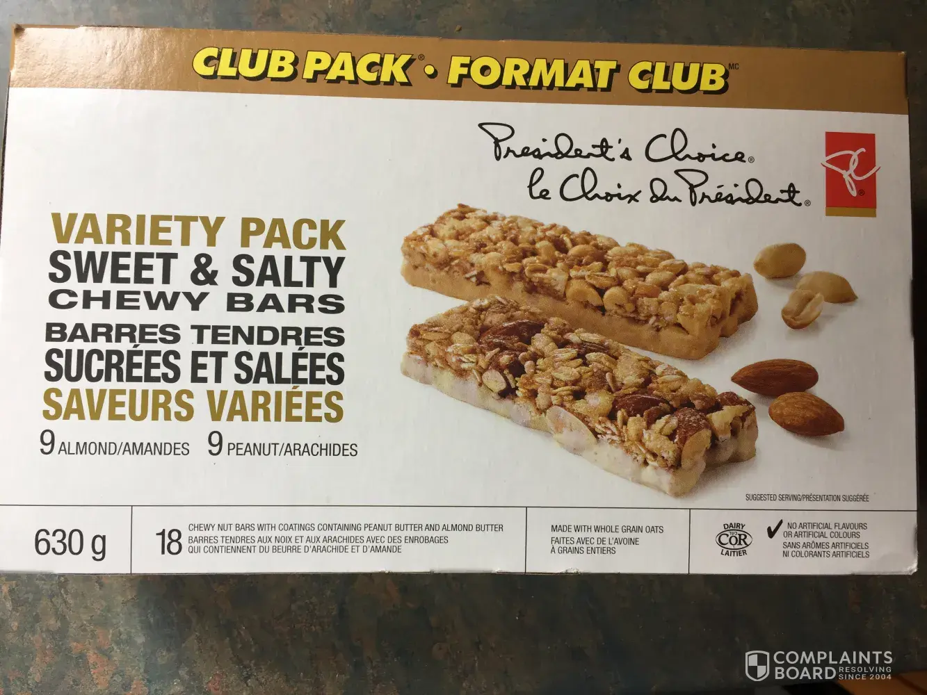 I have purchased a box of Presidents Choice Club Pack Sweet and Salty chewy bars. As described on the box it says it comes with 18 bars. 9 peanut and 9 almond. Upon opening the box I realized there was a lot of empty space. The box only contained 12 bars. That's only 66% of the product that I purchased.