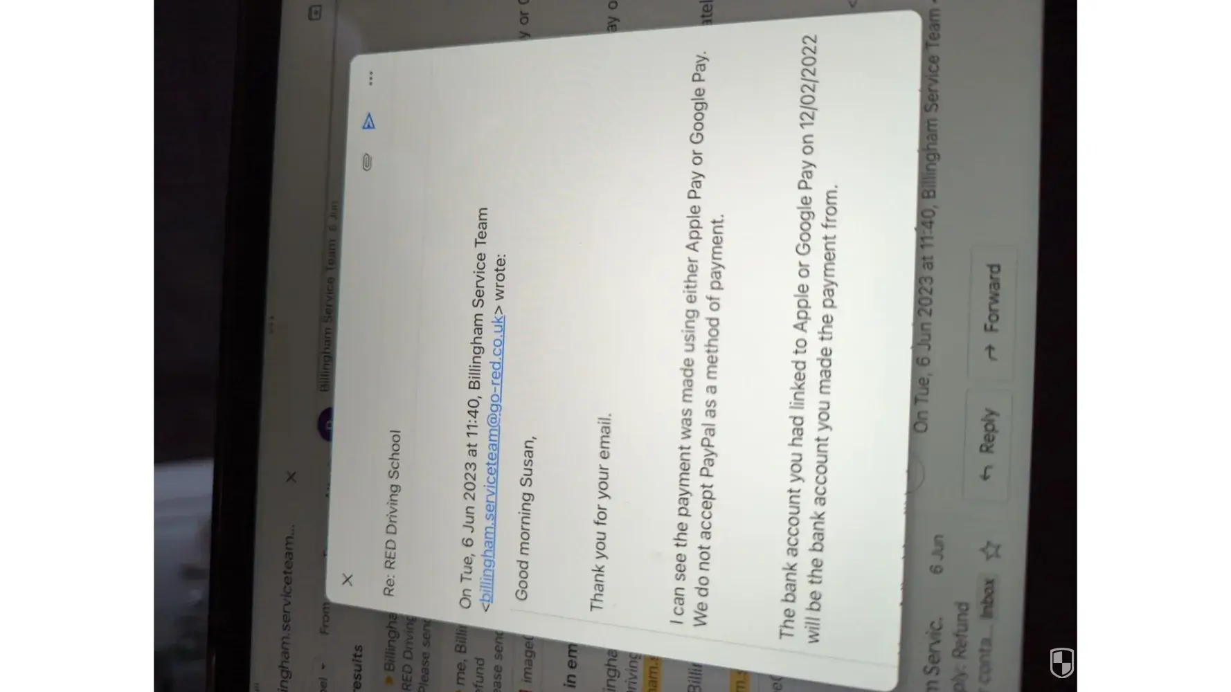 Hi on 12th Feb 2022 I paid red driving school 250 pound s into my son's driving lesson account on Google pay , through illness he's not able to carry on but they won't refund me , they have admitted they have the money but won't give it me back , red have told me I have paid by Google pay at 9 30 on 12/02/2022