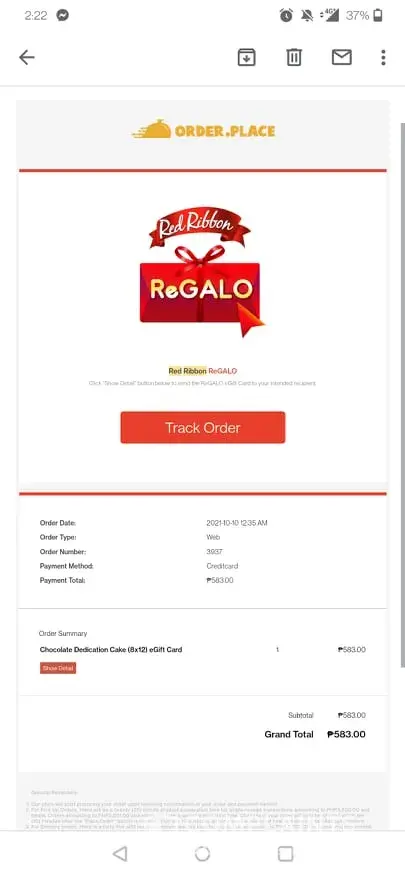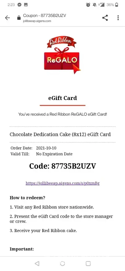 Last Oct 10 around past 12am, I purchased an e-gift card (Chocolate Dedication cake (8x12)) to give it to someone. The recipient went to a near red ribbon store to claim the egift at around 6pm at the same date (oct 10) and told by the staff to come back the next day. oct 11 (which is today) to claim it again because the code was said "INVALID". However, the recipient did went today to claim it again but unfortunately told by the staff that code was still INVALID.