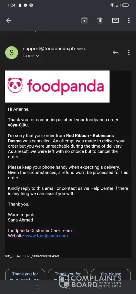 I just want to know when I can expect the refund of my order last November 4 from Red Ribbon - Robinsons Dasma. I ordered it through foodpanda, and it says it takes a lot of days before it can be processed. I cancelled it right away because the location is too far for me. My foodpanda number is v8ya-0j0u.