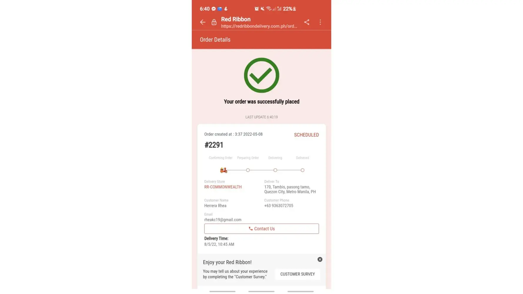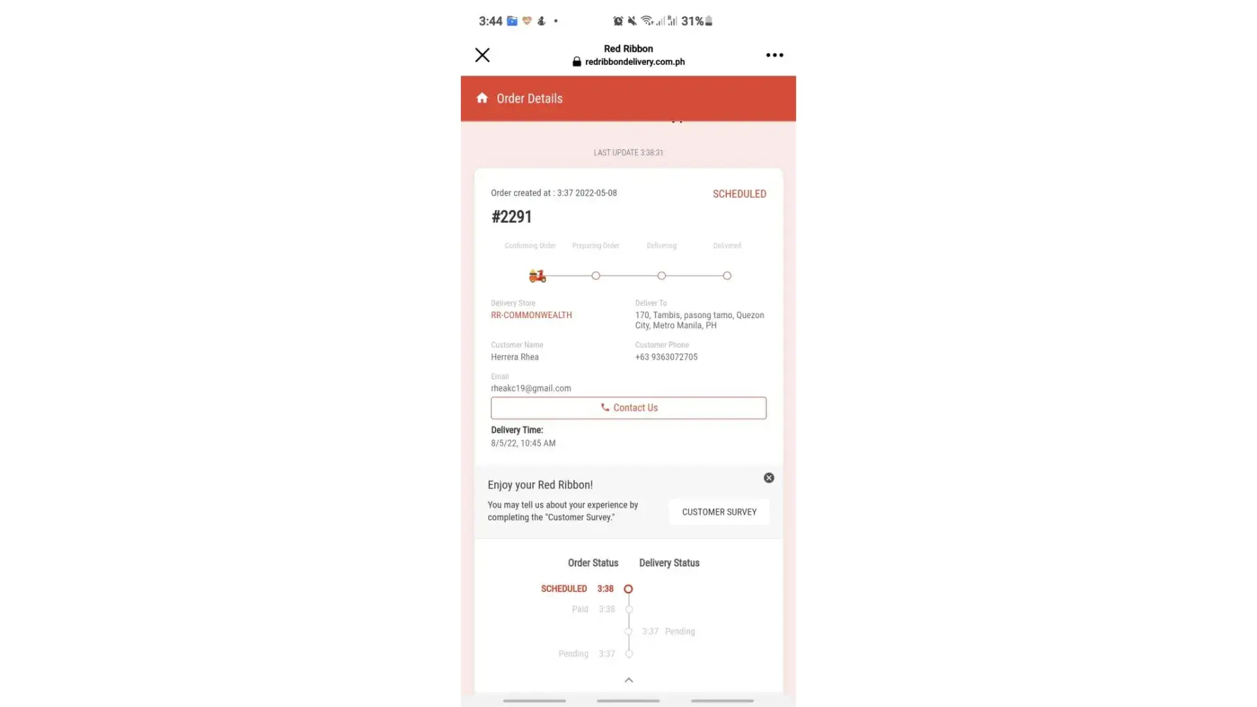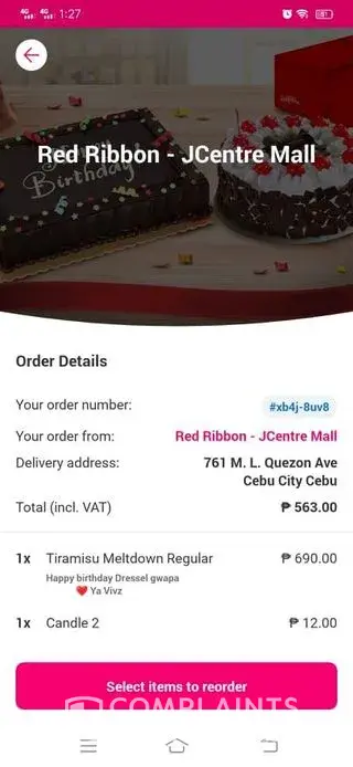 i ordered this morning a cake for my mom,supose to be dwlibered 10:45 Am but now its alreafy 11:44 am till now not yet received.i paid it tru gcash.my ordered no#2291 to red ribbon commonwealth don antonio brach.