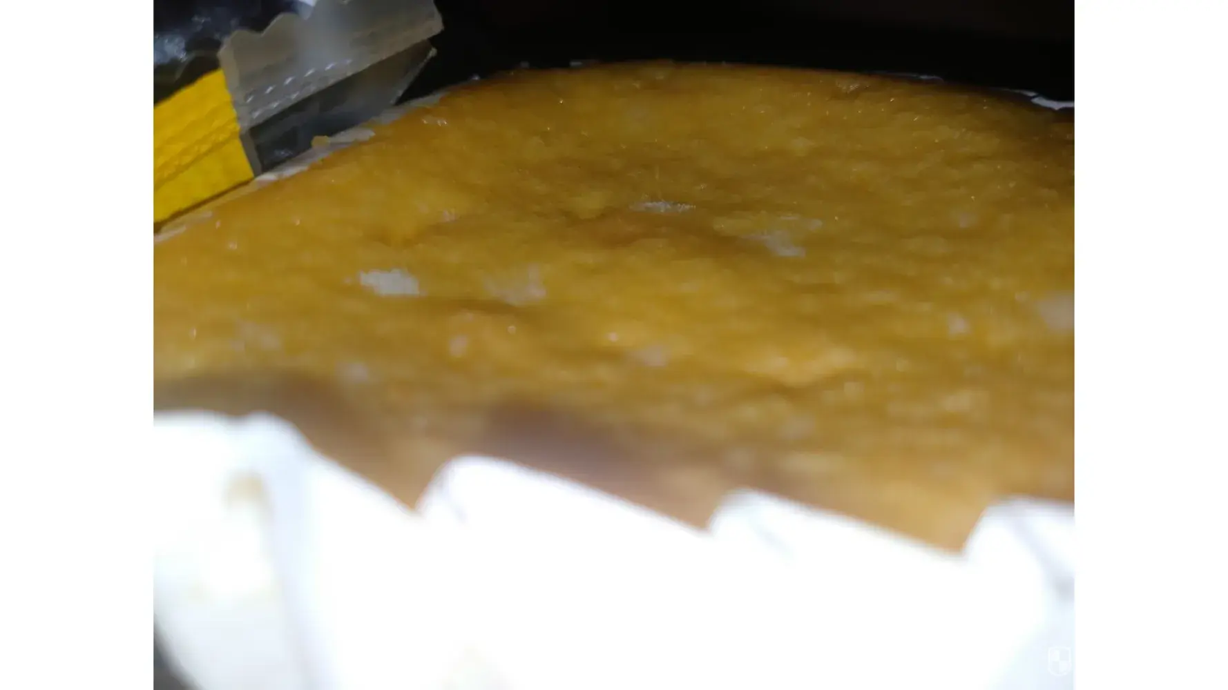 The cake is deformed, looks like an old stock with discoloration as yellowish portions in the cake (see pictures).