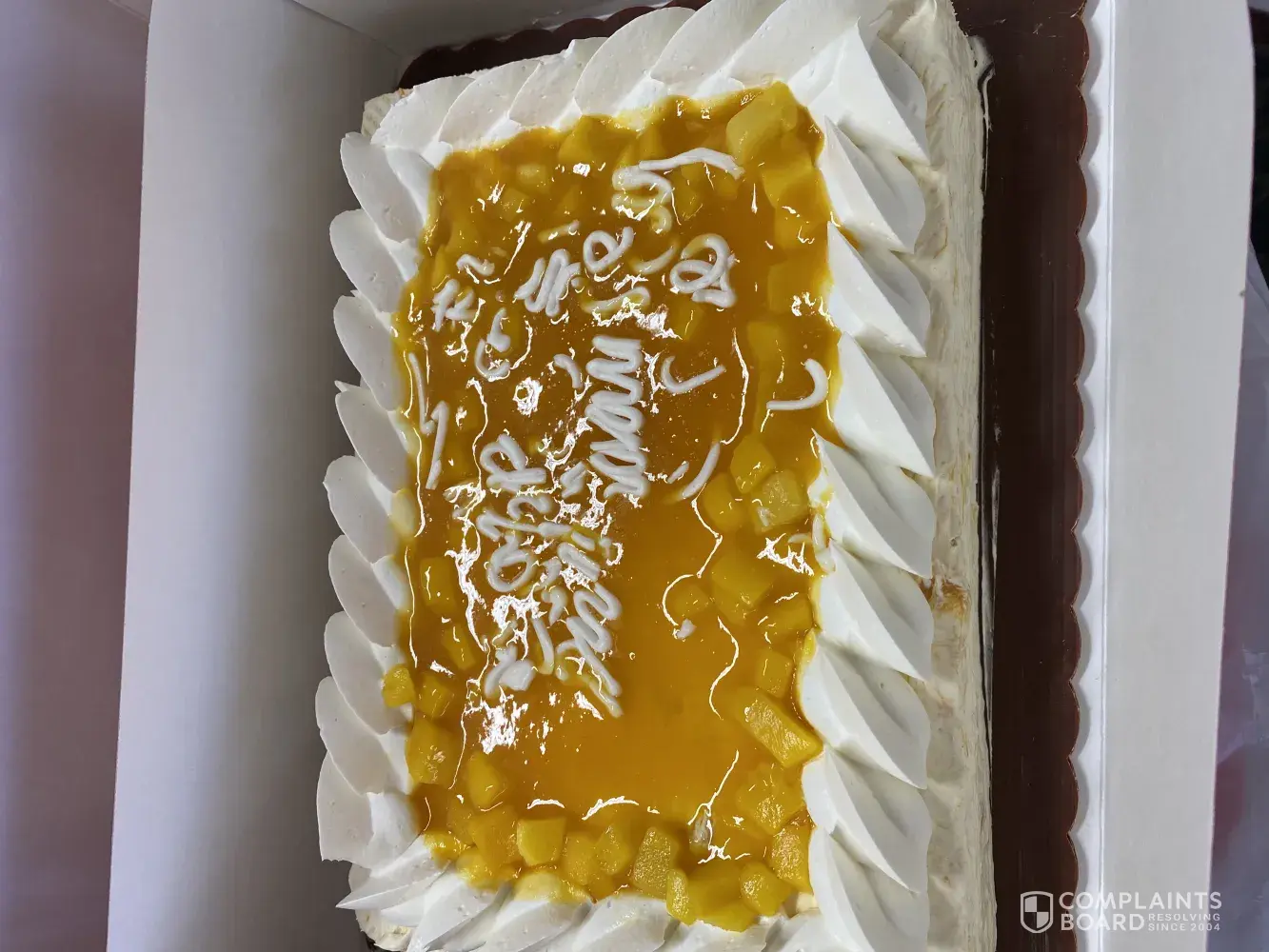 Hi, I ordered a mango cake the day before. I went to pick it up around 12:30pm today and it was suppose to be ready at 11:30. When I got there the name wasn't on it and I had to wait a few minutes for them to put it on. The lady told me not to shake it but I have to drive home. When I got home the name was unreadable and it was all over the cake so you can't read any words or even a letter. Hopefully next time the cake should be ready and when it gets picked up the customer should be in and out.