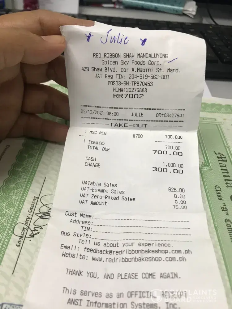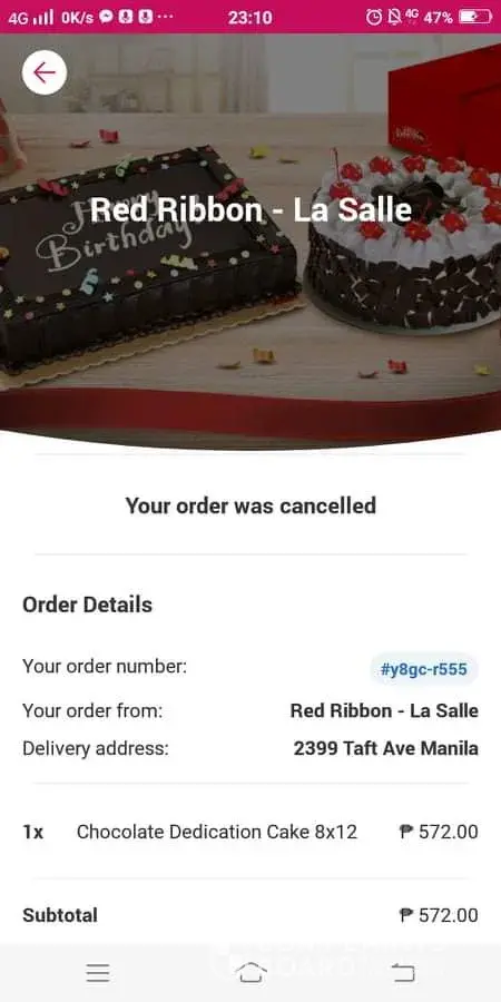 Omorder yung ate ko ng cake thru food panda sa red ribbon la salle last april 19 dahil birthday ko bayad na yun thru gcash pero walang dumating na cake sakin. Pumunta ako sa store ng red ribbon para magcomplain pero ang sinabi lang nila si food panda na yung may kasalanan don ni hindi nila alam kung napick up ba ng rider yun o hindi. Pumunta ako don para sana makuha yung details ng food panda rider pero wala sa log book nila. Ang tanging binigay lang sakin is yung resibo ng transaction nila sa food panda. Wala man lang way yung manager para ma actionan yung complain ko. Ni hindi man lang tumawag sa food panda regarding sa complain ko.