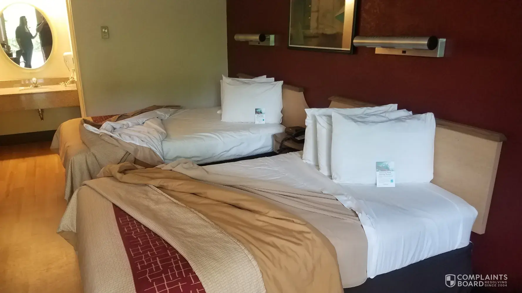 Staying at the Salem, new Hampshire red roof. Wow the room is disgusting. The beds were "turned down", they were not even made. It is not maintained at all. Was supposed to have a king bed and got stuck with 2 doubles. 0 refund for the change. Would have left but had driven for 18hrs and my wife and i just didnt have it in us to find anything else. Please get this location straightened out.