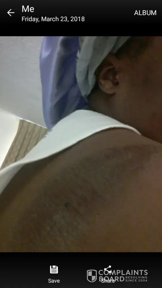 When I woke up the next morning i had burning feeling on my shoulder and had big rash on my shoulder. The Email that was on the paper I sent a message to. They never redponded its like they dont care. Anything that happens in and on thier grounds their responsible for. I didnt pay 125 for a room to leave with a burn. For them not to respond back bad business. Never again will i stay there.