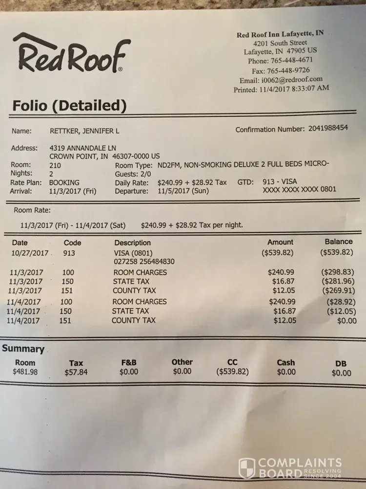 I booked a two night stay Nov.3-5 with booking.com. for the Red Roof Inn in Lafayette, IN. I later changed to just a one night stay Nov 3-4 because there were no activities we were attending Sunday. I received a confirmation email that I had been changed to one night at the price of $269.91. I felt this was a rip-off, but it was family weekend at Purdue, so it was all we could find. When I checked in Nov.3rd I confirmed with the woman working that it had been changed to one night. She confirmed that it had been changed and I signed for the one night charge. When I went to check out in the morning on Nov.4th I was told they had a two night minimum and that I could stay again that night. I told him no and that the two night minimum had never been mentioned before. He told me it was too late, he had already charged my credit card for two nights. I did not ageee to paying for two nights and feel it should be illegal for him to automatically charge my credit card without my consent. I went back over all of my emails and it never was mentioned that there was a two night minimum.