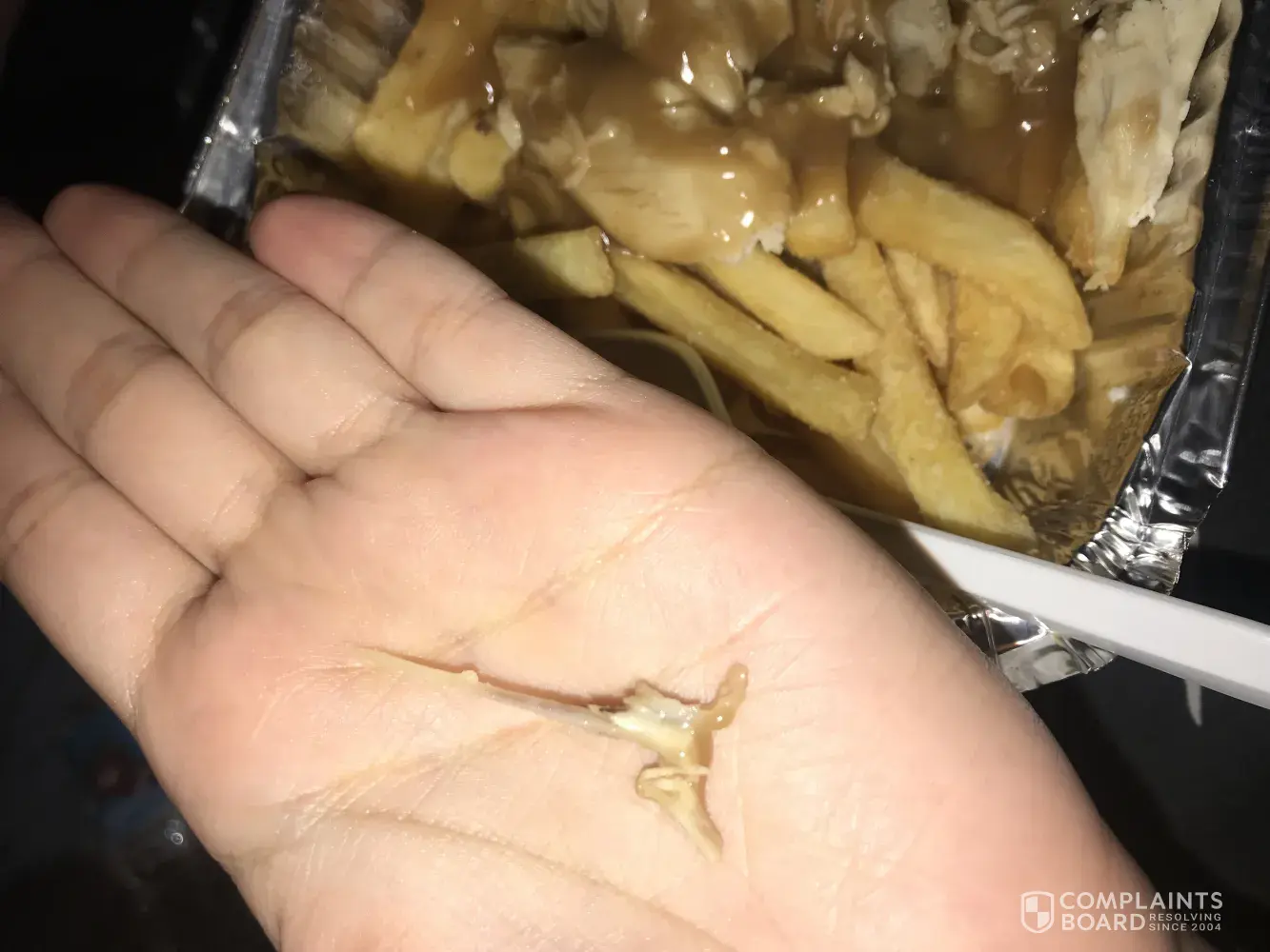 I ordered a $5 chicken loaded chips and $5 10 nuggets.. I've gotten home to enjoy my meal that I've just spent money on to be chocking on a bone 1 minuet later, it's not a small bone, I'm very disappointed and as the bone is sharp I'm lucky I didn't swallow!