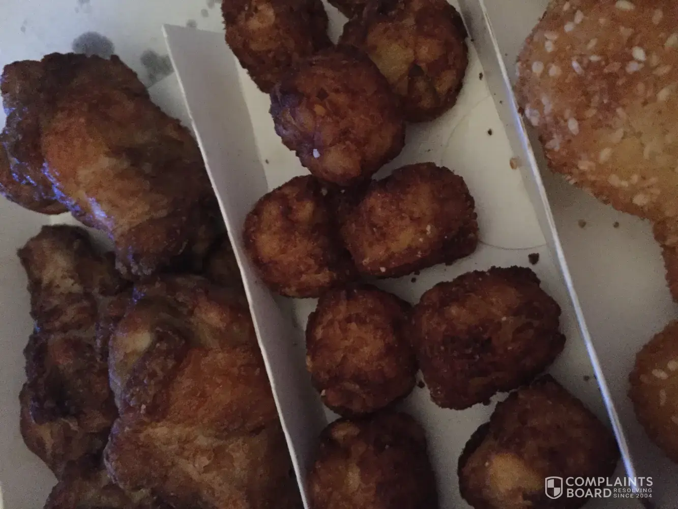 We ordered the dippers box tonight & were unhappy when noticing the potato gems were almost burnt & tasted burnt. And then my daughter went to eat a cheesy nugget & noticed 2 nuggets stuck together bonded by a thick piece of stringy chicken grissle.
