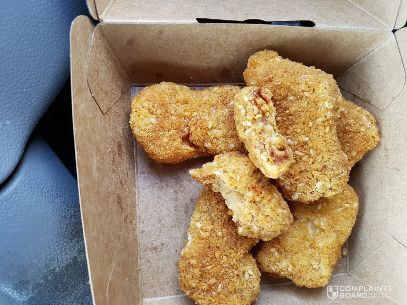 The cheesy nuggets I purchased through drive-thru a so dehydrated overcooked and old I can snap them in half .