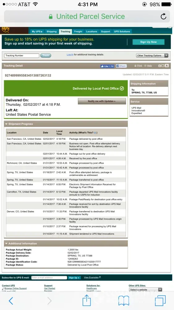 My name is Rachel Fendt and I recently ordered a large package of stickers from your website. I have ordered from your company before, and never had an issue. However, I have had significant difficulty tracking and receiving this order. Your website told me that my package would arrive between January 27th and February 1st. I’ve been attempting to track it, but it wasn’t moving at all. UPS now has it’s estimated arrival date as February 4th.