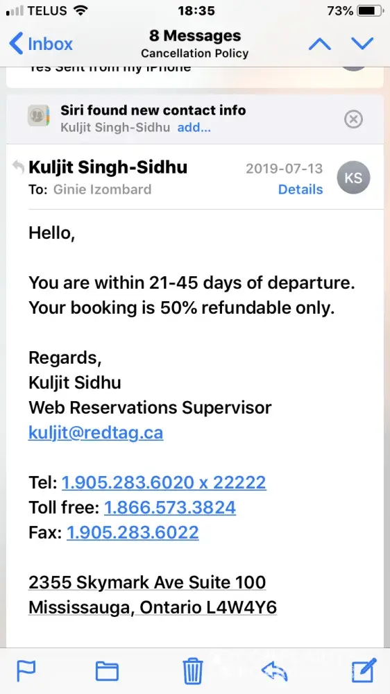 I was planning a trip to Niagara however my partner came down with shingles. I had booked a hotel with RedTag and my confirmation email said I couldn't cancel between September 8-11th. I called the Sheridan on September 7th to cancel and they advised to reach out to RedTag. I emailed RedTag to let them know I needed to cancel and I received an email back saying someone would reach out the next day. I did not receive a call. I called and waited on the phone for 50 minutes only to be told my file was currently open and the employee couldn't access my file and to call back. I indicated I waited quite some time so reach the employee and he said he would call be back. He did not. I sent a follow up email and was told I did not cancel in time and would be getting a refund. However, I reached out before September 8th and did not receive a timely response. I was told the office closed at 5pm and as such did not reach the deadline. The confirmation email did not have any indication of time. I reached out the day before the deadline provided to me. I was then told I basically had to cancel my room in order to see if I would even get a refund and if the supplier would waive the fee. The supplier apparently would not. I then reached out to the Sheridan and they had indicated they would be willing to waive the fee. RedTag is still claiming they are waiting on the supplier for a response to see if they will waive the fee. It has been 11 days since the cancellation. I feel RedTag misled me by not providing a time frame and was happy to cancel my room and take my money. I feel I have not received the proper service and I want my refunded money back.