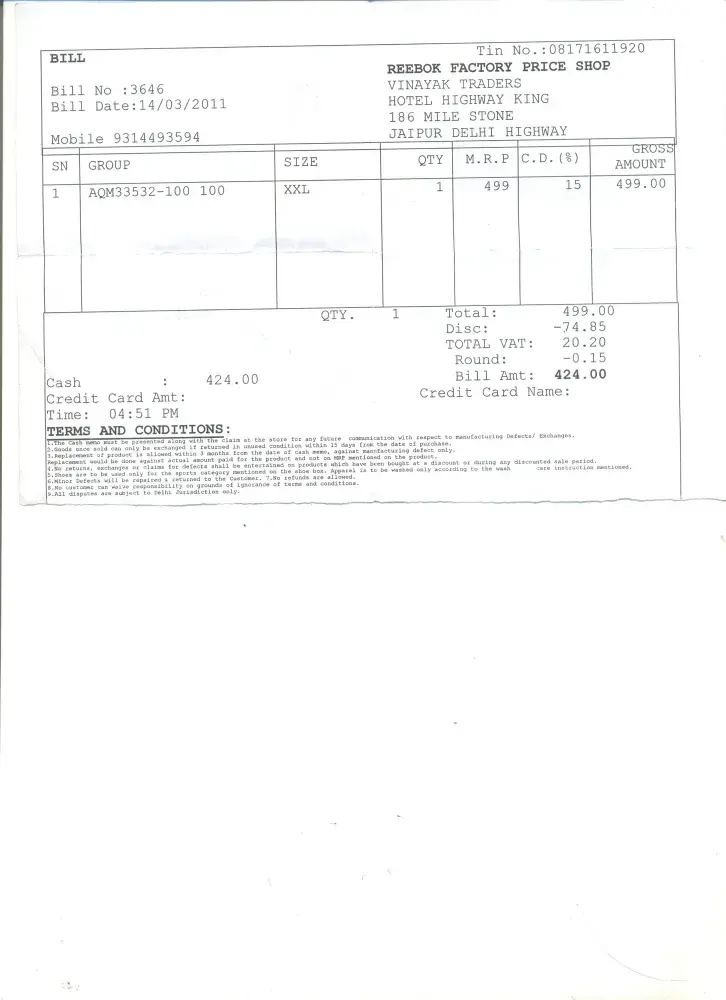 I've purchased one Reebok T-shirt from the above mentioned store on 14/03/2011 in Jaipur after confirming that it could be exchanged from PAN India Reebok factory Proice shop branches.